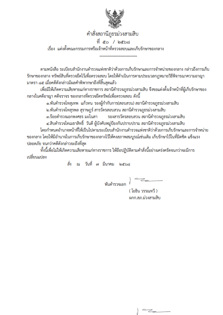 คำสั่งมอบหมายให้ข้าราชการตำรวจปฏิบัติหน้าที่ กำกับ ควบคุม ดูแล และตรวจสอบของกลางในคดีอาญาและของกลางอย่างอื่น