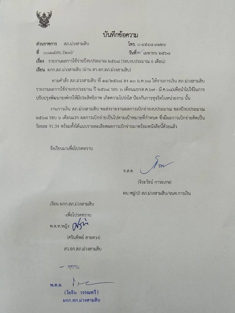 รายงานการใช้จ่ายงบประมาณของสถานีตำรวจภูธรม่วงสามสิบ ประจำปีงบประมาณ 2568
