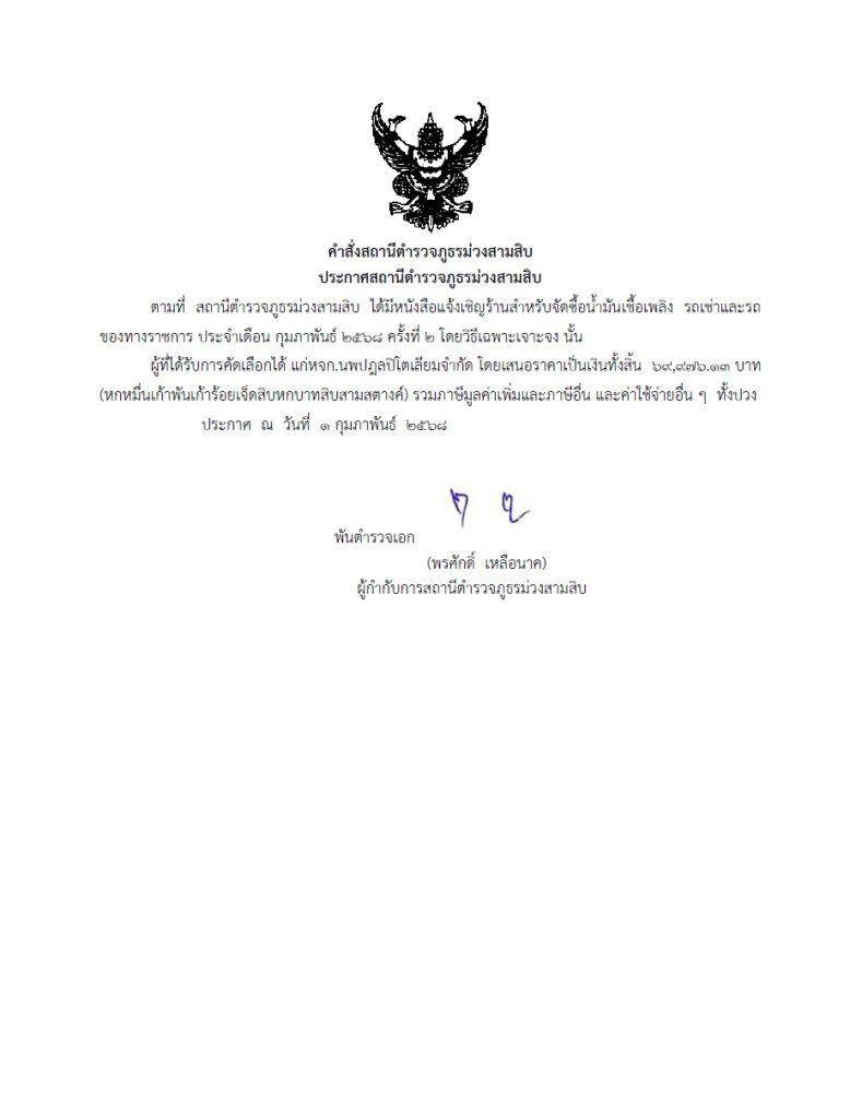 ประกาศผู้ชนะในการเสนอราคาจัดซื้อจัดจ้างน้ำมันเชื้อเพลิง เดือน กุมภาพันธ์ 2568