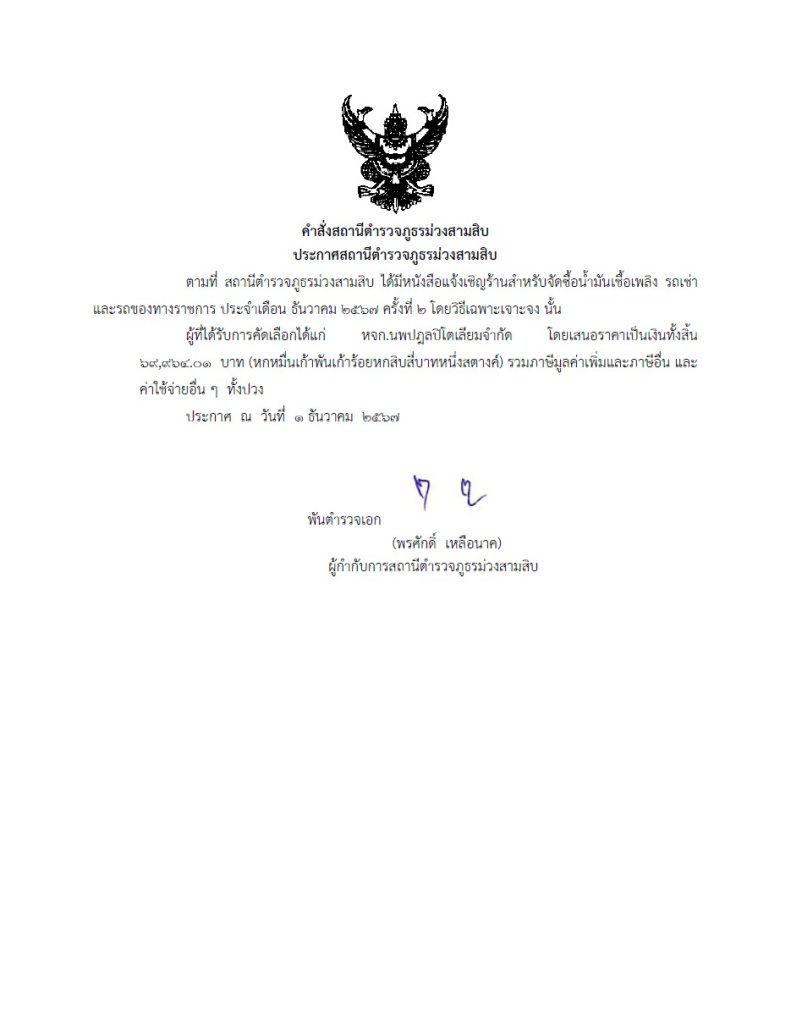 ประกาศผู้ชนะในการเสนอราคาจัดซื้อจัดจ้างน้ำมันเชื้อเพลิง เดือน ธันวาคม 2567