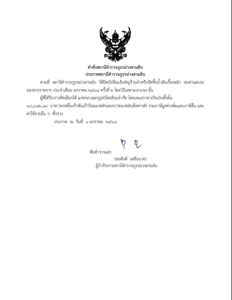 ประกาศผู้ชนะในการเสนอราคาจัดซื้อจัดจ้างน้ำมันเชื้อเพลิง เดือน มกราคม 2568
