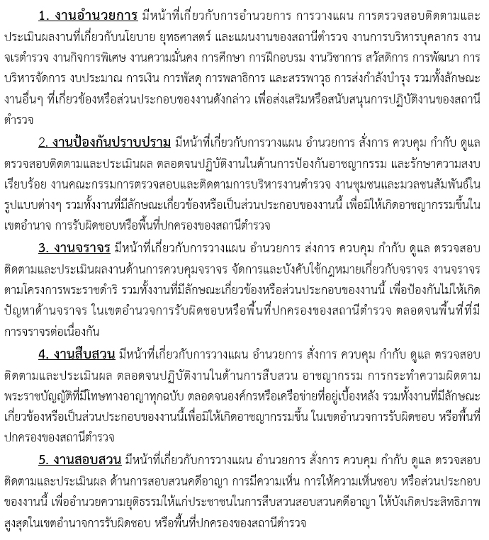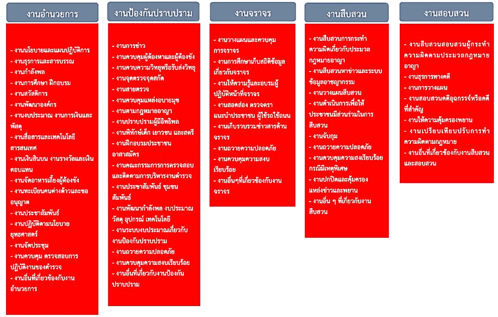 – ลักษณะงานภายในสถานีตำรวจแบ่งเป็น 5 สายงานดังนี้